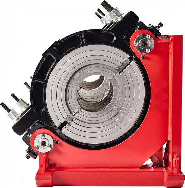 - Центраторо с гидравлическим приводом и 4-мя прочными широкими зажимами, один из которых легко может быть удален для облегчения сварки полимерных фитингов с трубами (тройники, крестовины, отводы), имеет большой запас прочности за счет качественного сплава и ребер жесткости, что позволяет сваривать полимерные трубы с любым показателем SDR